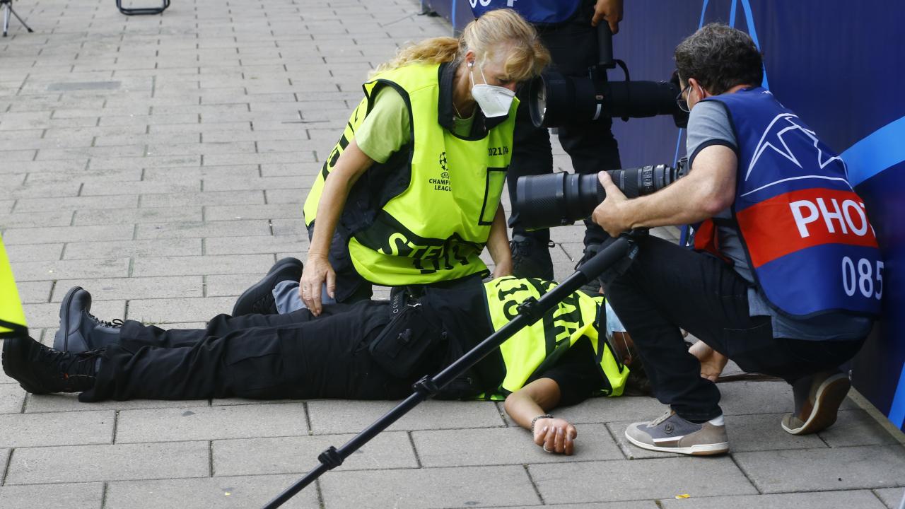 Kale arkasında duran görevli, çarpmanın etkisiyle bayılırken, Ronaldo ve çevredekiler de panik yaşadı.