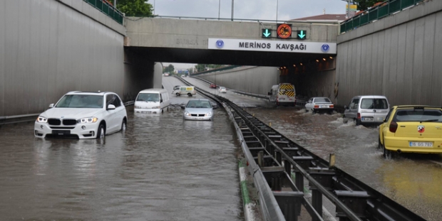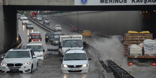 Alınan bilgiye göre, saat 14.30 sıralarında bastıran şiddetli yağış hayatı olumsuz etkiledi. Vatandaşlar yaz yağmuruna hazırlıksız yakalandılar. Merinos Köprülü Kavşağı’nda rögarlar tıkanınca göle dönen yolda araç sürücüleri mahsur kaldılar. Vatandaşlar araçlarını suların içerisinden çıkaramadı.