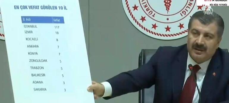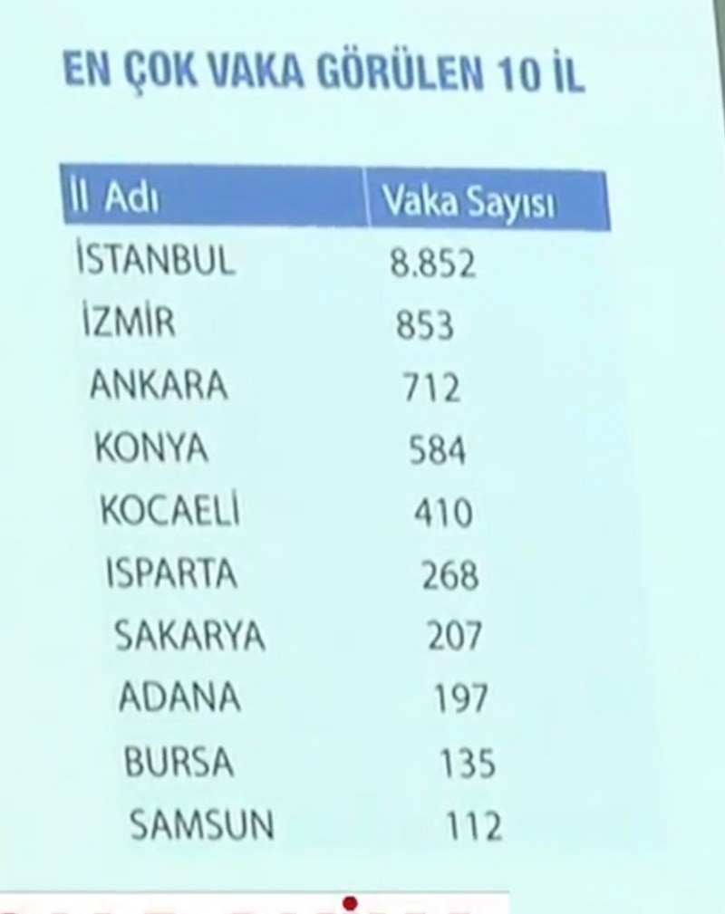 İşte Vaka sayımızı gösteren tablo. Sayılarımız artıyor ama vakalarımız içindeki ölüm oranı 1.58. Bu anlamda birçok ülkeden aşağıda olduğumuzu belirtmek istiyorum. Hedefimiz burada hayatını kaybeden vatandaşlarımızın sayısını azaltmak. Bugüne kadar illerimizdeki dağılımı göstermemiştik. İtalya’da bir bölgeden bütün İtalya’ya virüsün yayılmasına sebep oldu. Biz de o hatayı işlemek istemedik. Artık bütün illerimizde bu vakanın olduğunu biliyoruz. Daha çok vaka İstanbul’da. İstanbul’daki vaka sayısı 8 852. %60’lara yakın. 853 vaka İzmir, 752 vaka Ankara, 410 vaka ise Kocaeli.