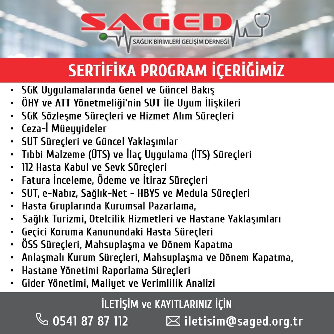 • SGK Uygulamalarında Genel ve Güncel Bakış• ÖHY ve ATT Yönetmeliği’nin SUT İle Uyum İlişkileri • SGK Sözleşme Süreçleri ve Hizmet Alım Süreçleri • Ceza-İ Müeyyideler • SUT Süreçleri ve Güncel Yaklaşımlar• Tıbbi Malzeme (ÜTS) ve İlaç Uygulama (İTS) Süreçleri • 112 Hasta Kabul ve Sevk Süreçleri• Fatura İnceleme, Ödeme ve İtiraz Süreçleri• SUT, e-Nabız, Sağlık-Net – HBYS ve Medula Süreçleri • Hasta Gruplarında Kurumsal Pazarlama, Sağlık Turizmi, Otelcilik Hizmetleri ve Hastane Yaklaşımları• Geçici Koruma Kanunundaki Hasta Süreçleri• ÖSS / TSS Süreçleri, Mahsuplaşma ve Dönem Kapatma • Anlaşmalı Kurum Süreçleri, Mahsuplaşma ve Dönem Kapatma,• Hastane Yönetimi Raporlama Süreçleri• Gider Yönetimi, Maliyet ve Verimlilik Analizi