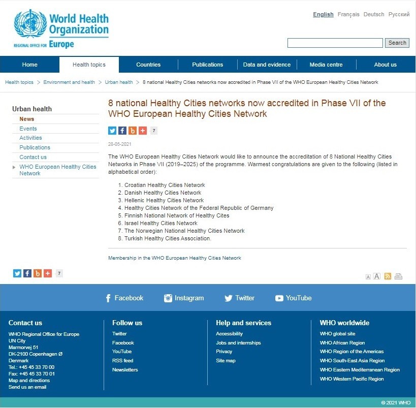 Kurulduğu 2005 yılından itibaren kriterleri yerine getirerek üyelik başvuruları kabul edilen Türkiye Sağlıklı Kentler Birliği böylelikle 7.Faz üyeliği de kabul edilmiş oldu.
