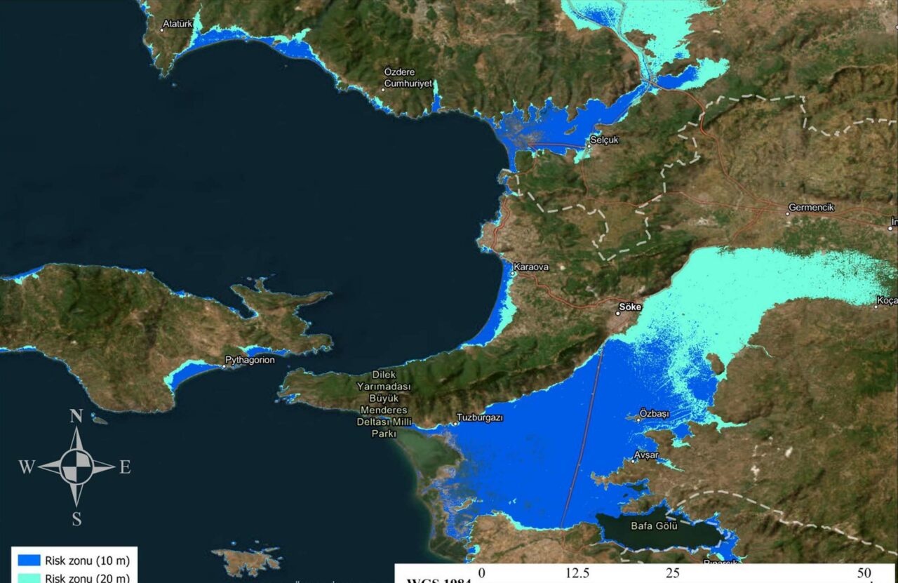 Foça’dan başlayarak Bayraklı, İzmir ve Urla Yarımadası etrafından 10 metrelik ve 20 metrelik risk zonları geniş alanlar kapladığına işaret eden Özçelik, “İleriye gittiğimiz zaman Kuşadası, Latmos Körfezi, karşısında Sisam Adası, aşağıya indimiz zaman Didim, Güllük Körfezi, Gümüşlük, Turgutreis, Bodrum, Akyaka, Ören, Turgut, Marmaris, Köyceğiz, Sarıgerme ile Fethiye’nin 5 ve 10 metrelik deniz taşkınları risk bölgesinde yer aldığı görülüyor.” dedi.