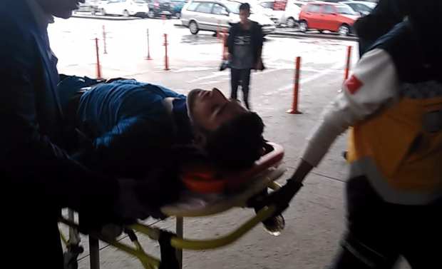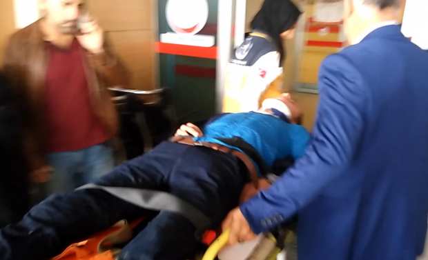 Sedye üzerine koyulan yaralı uzman çavuş, zeminin kaygan olması sebebiyle güçlükle yola kadar çıkarıldı.
