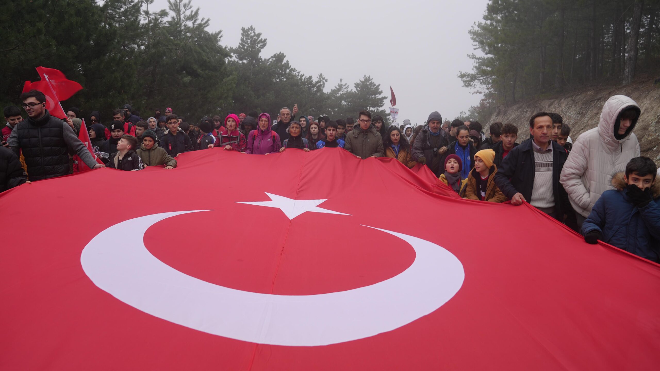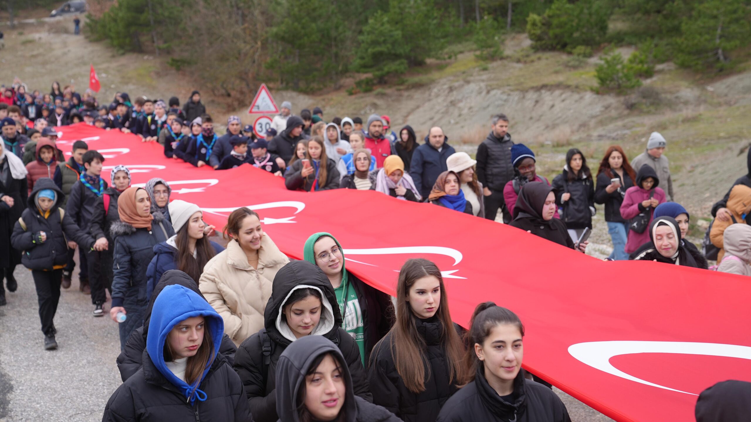 Türk bayrakları ile kortej yürüyüşünü başlatan grup, Ericek Köyü’nden Ericek Adrenalin Park’a kadar yaklaşık dört kilometrelik yolu yoğun yağış ve sis altında yürüdü.