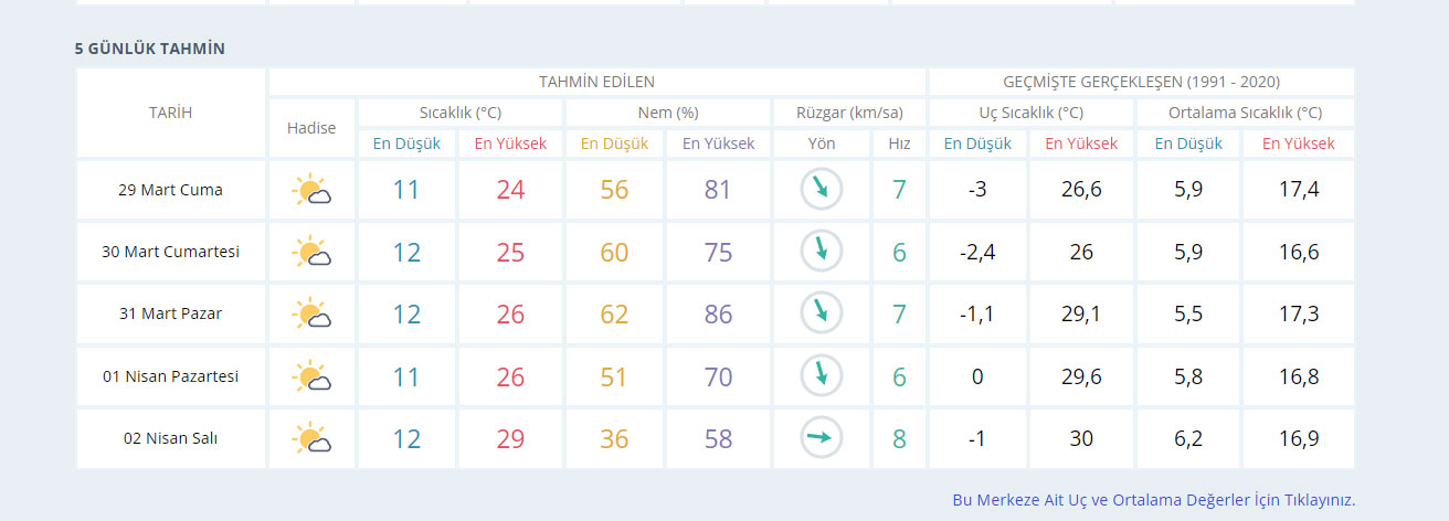 31 Mart Pazar günü ise Bursa’da yağış beklenmiyor. Sıcaklık en yüksek 26 derece civarında.