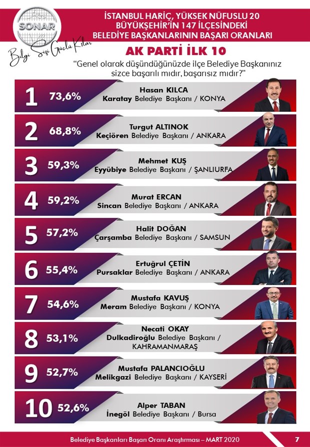 SONAR Araştırma, yerel seçimlerin birinci yıldönümünde İstanbul hariç 20 büyükşehirdeki nüfusu yüksek olan 147 ilçenin belediye başkanlarının başarı performansını ölçtü.