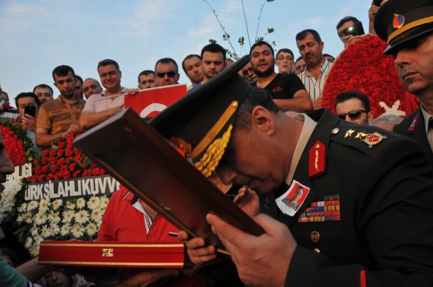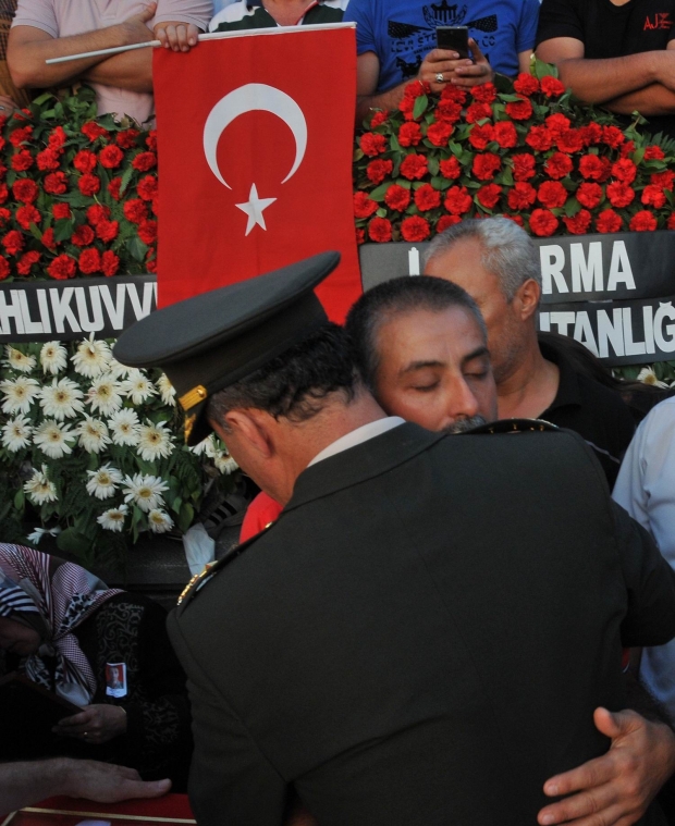 Şehit çavuşun fotoğrafını öpen Tümgeneral Saldık, Muhsin Aydın’a sarılıp gözyaşı döktü. Saldık, şehit ailesine Türk Bayrağı hediye etti.