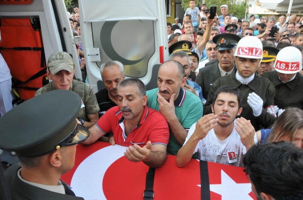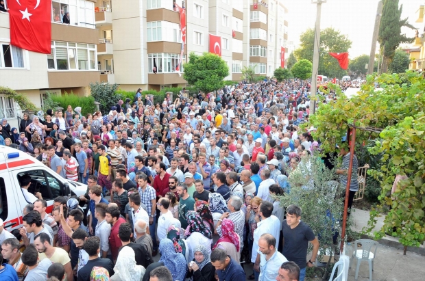 Bahadır Aydın’ın Ulucami’de kılınan cenaze namazının ardından evinin önünde yapılan duaya da yüzlerce kişi katıldı. Ambulansla taşınan anne Emine Zülfiye Aydın ambulansın Bursa trafiğine takılması nedeniyle eve yarım saat gecikmeli geldi. Baba Aydın’ın isteği üzerine evin önündeki dua uzatılıp şehidin annesinin gelmesi beklendi. Tabuta ve birbirlerine sarılan şehidin anne, babası ve erkek kardeşi teröre lanet okuyup “Allah onları o dağlarda süründürsün. Allah onları perişan eylesin” diyerek tepki gösterdi.
