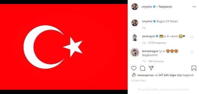Atina tatiliyle belgelenen Cem Yılmaz ve Serenay Sarıkaya aşkı doludizgin devam ediyor. Koronavirüs salgını nedeniyle aynı evde karantinada olan ikili, aşklarını sosyal medyaya da yansıttı. Serenay Sarıkaya, bugün doğum günü olan sevgilisinin ınstagramdan yaptığı 23 Nisan Ulusal Egemenlik ve Çocuk Bayramı paylaşımının altına “İyi ki varsın” yorumunu yaptı. Sarıkaya’nın yaptığı yorum ise binlerce beğeni aldı.