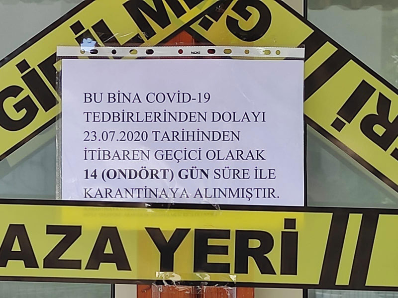 Ayrıca “Bu bina Covid-19 tedbirlerinden dolayı 14 gün karantinaya alınmıştır” yazılı not asıldı.