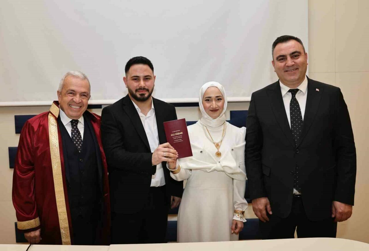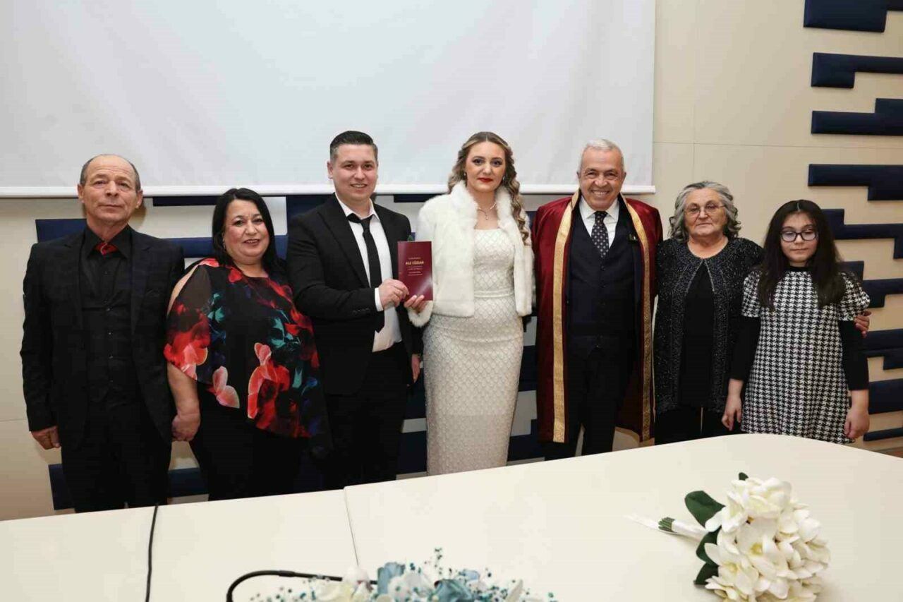 “Sevgililer Günü”nde bir ömür boyu mutluluğa ‘Evet’ diyen çiftleri tebrik eden Başkan Şadi Özdemir, hoşgörü içinde sevgi ve saygıya dayalı bir evlilik diledi. Evlilik cüzdanlarını çiftlere teslim eden Başkan Şadi Özdemir, günün anısına fincan takımı hediye etti. Ayşe Can ile Engin Geyik çiftinin nikahlarına Büyükşehir Belediyesi Başkanvekili Mehmet Aydın Saldız da katılarak çiftlerin mutluluğuna ortak oldu.