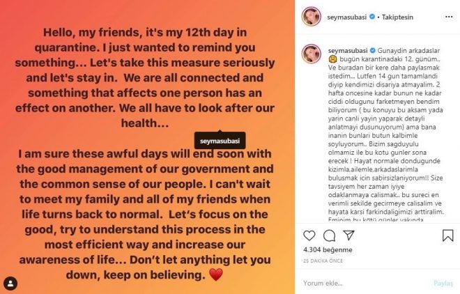 “Günaydın arkadaşlar. Bugün karantinadaki 12. günüm… Ve buradan bir kere daha paylaşmak istedim… Lütfen 14 gün tamamlandı deyip kendimizi dışarıya atmayalım. 2 hafta öncesine kadar bunun ne kadar ciddi olduğunu fark etmeyen bendim biliyorum (bu konuyu bu akşam ya da yarın canlı yayın yaparak detaylı anlatmayı düşünüyorum) ama bana inanın bunları bütün kalbimle söylüyorum…