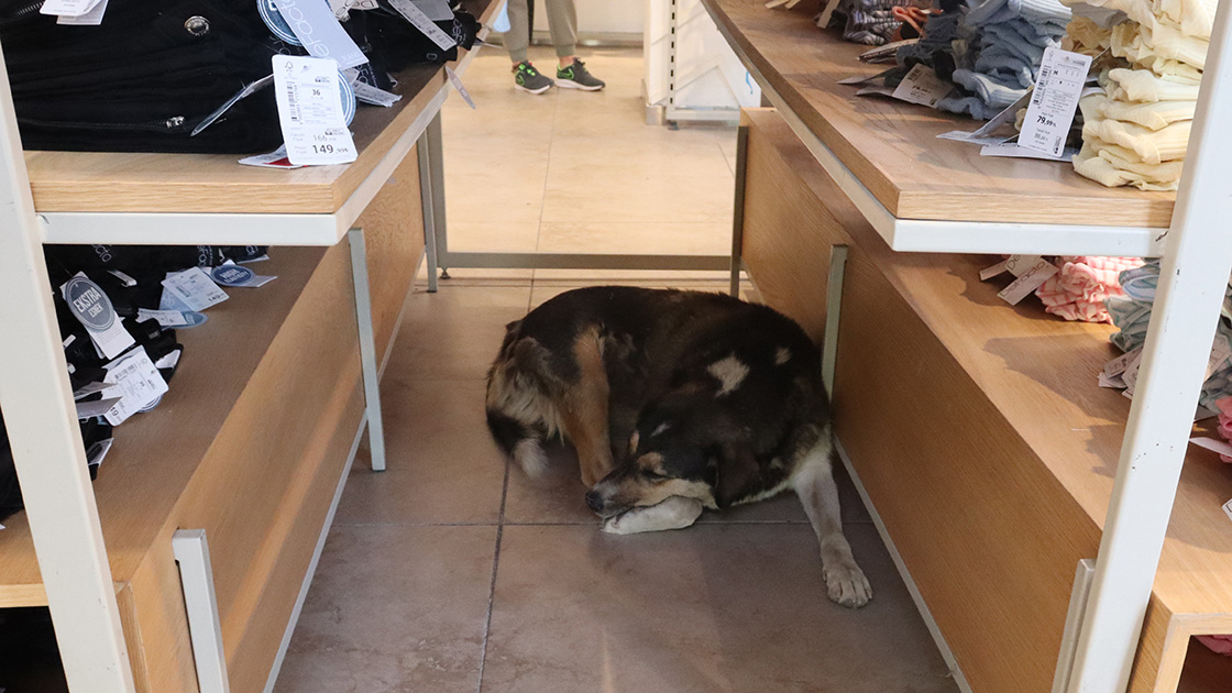 Caddedeki klimalı iş yerlerine giren hayvanlar, bir köşede yatarak serinliyor. Müşteriler, genellikle uyuyan hayvanları rahatsız etmemek için dikkatli şekilde yanlarından geçiyor, bazıları da sahipsiz köpekleri seviyor.