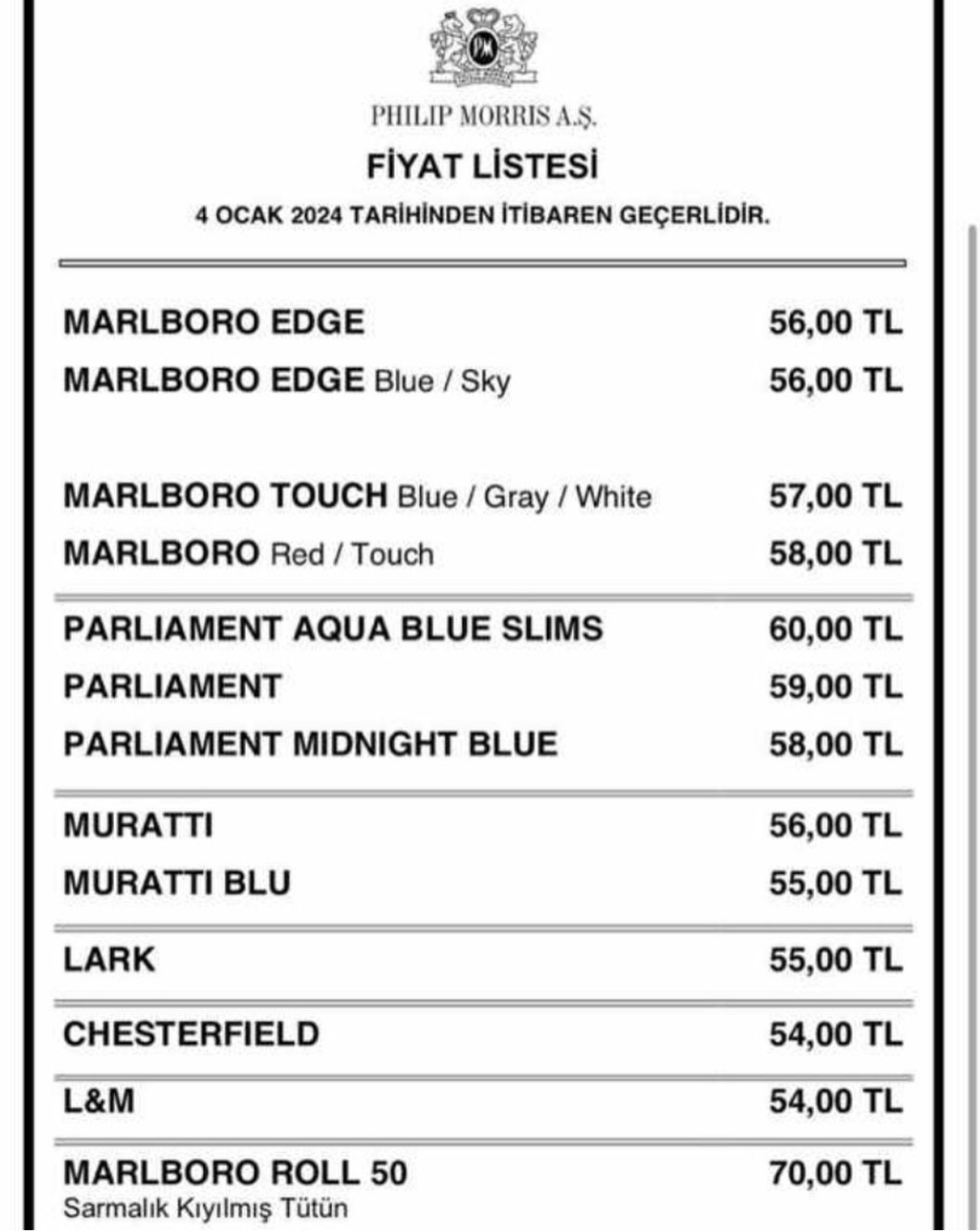 Son zamlarla birlikte aynı sigara grubundaki en ucuz sigara fiyatı 56 TL’ye çıktı. En pahalı sigara ise 70 TL oldu.