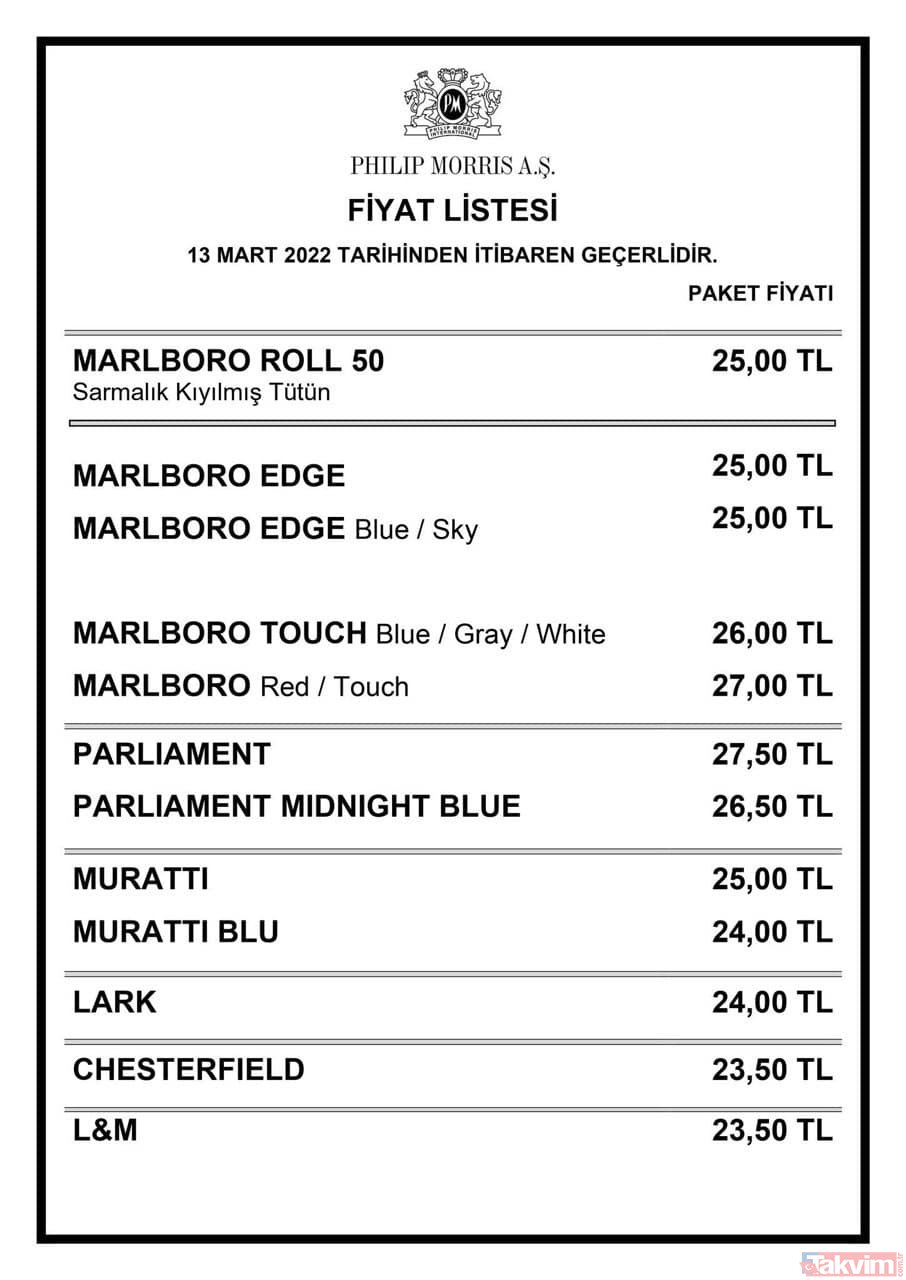 Tekel Bayileri Yardımlaşma Derneği Yönetim Kurulu Başkanı Erol Dündar’ın paylaştığı listeye göre; Philip Morris grubu, sigaraya 2 lira zam yaptı.