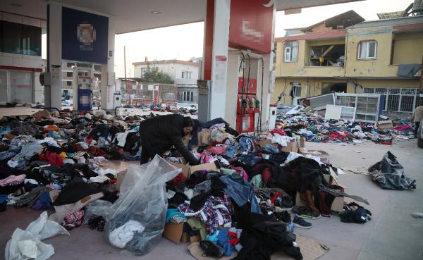 Depremzedeler de yerlere saçılan kıyafetler arasında kendilerine uygun olanları aradı.