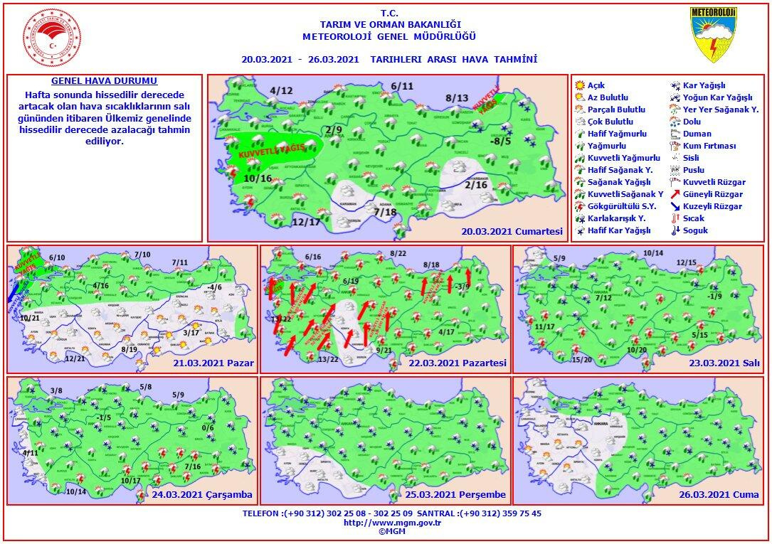 Hafta sonunda hissedilir derecede artacak olan hava sıcaklıklarının Salı gününden itibaren Ülkemiz genelinde hissedilir derecede azalacağı tahmin ediliyor. pic.twitter.com/veaCqSjqIB— Meteoroloji (MGM) (@meteoroloji_twi) March 19, 2021