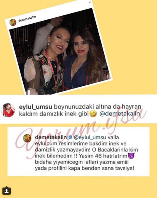 Yorumu gören Demet Akalın ise,” Eylülcüm resimlerine baktım. İnek ve damızlık yazmayaydın! O bacaklarınla kim inek bilemedim! Yaşım 46 hatırlatırım. Bir daha yiyemeyeceğin lafları yazma emi ya da profilini kapa benden sana tavsiye” mesajını yazarak tepkisini gösterdi.