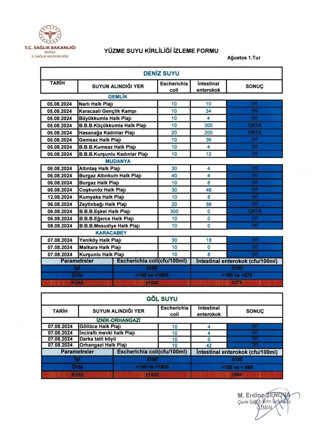 Ölçümlerin ardından çıkan sonuçlar kılavuz değerlerinin altındaysa iyi kalitedeki su (girilebilir), kılavuz değerle zorunlu değer arasındaysa orta kalitede su (girilebilir), zorunlu değerlerin üzerindeyse kötü kalitede su (girilemez) olarak değerlendiriliyor.