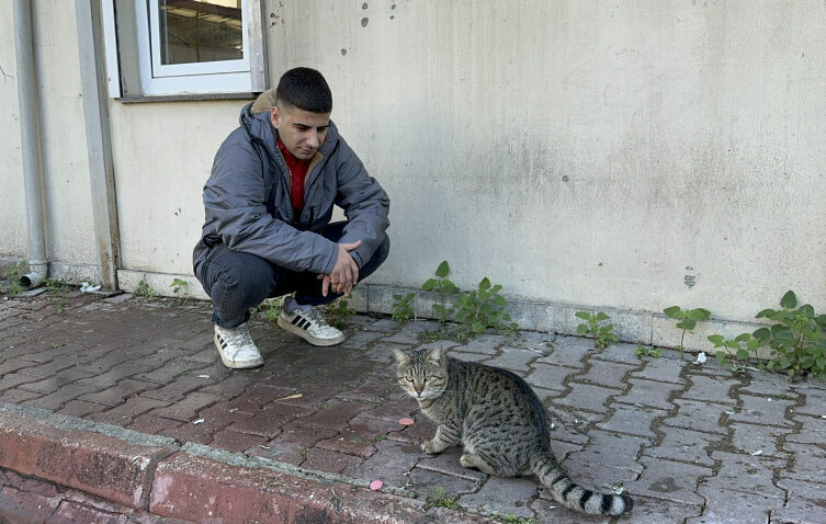 Kedinin hasta olduğunu, bakımıyla ve beslenmesiyle de zaman zaman arkadaşlarıyla ilgilendiğini ifade eden Alkacılı, yeniden iş yerinin önüne gelen kediyi elleriyle besledi.
