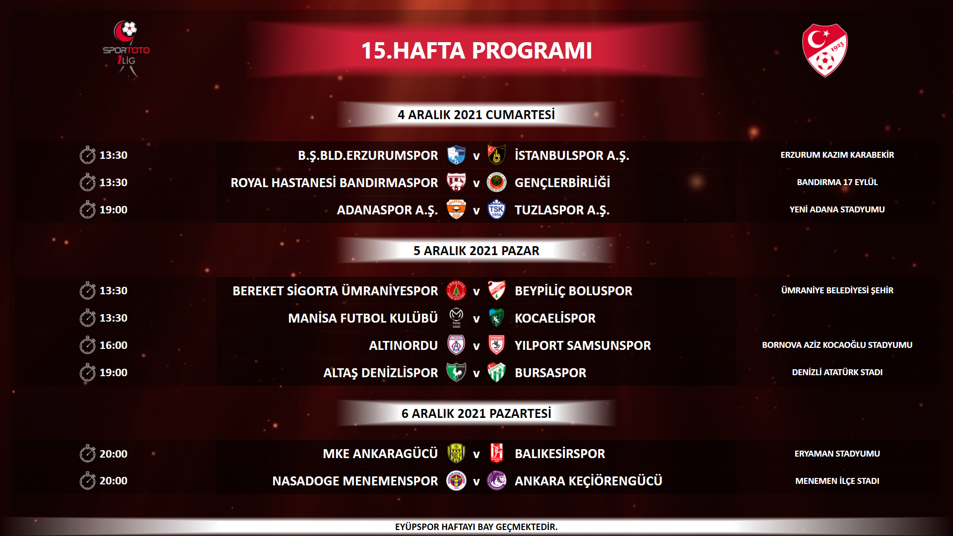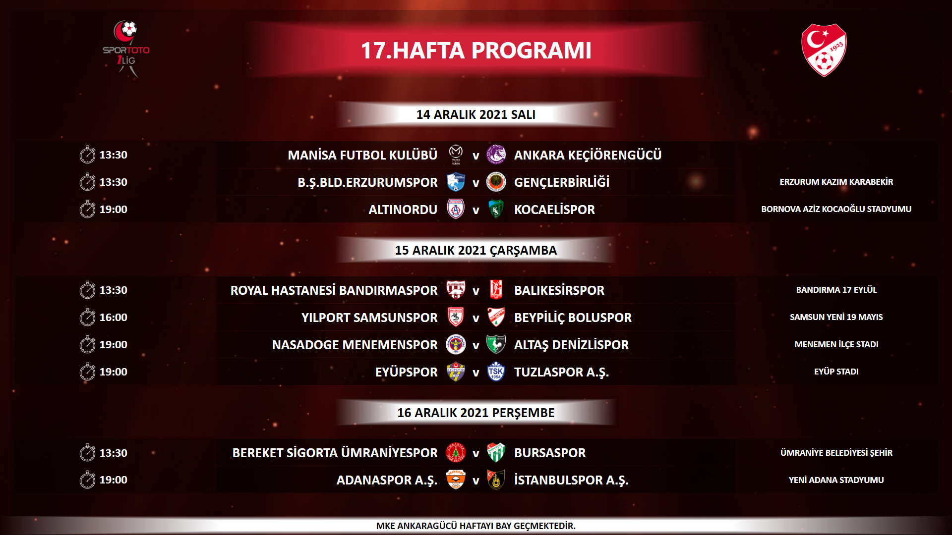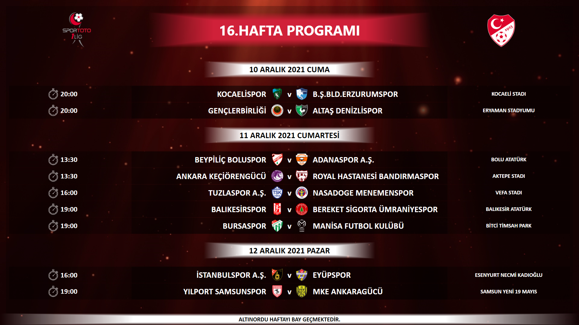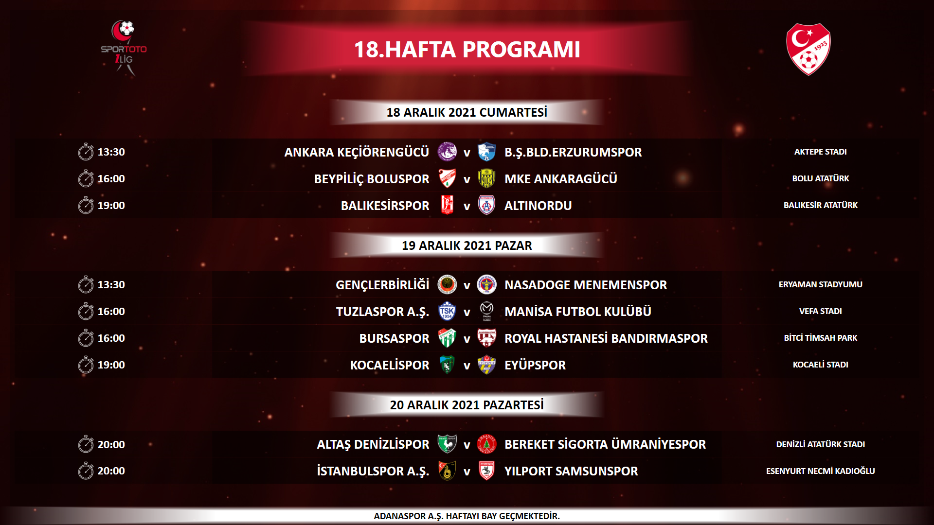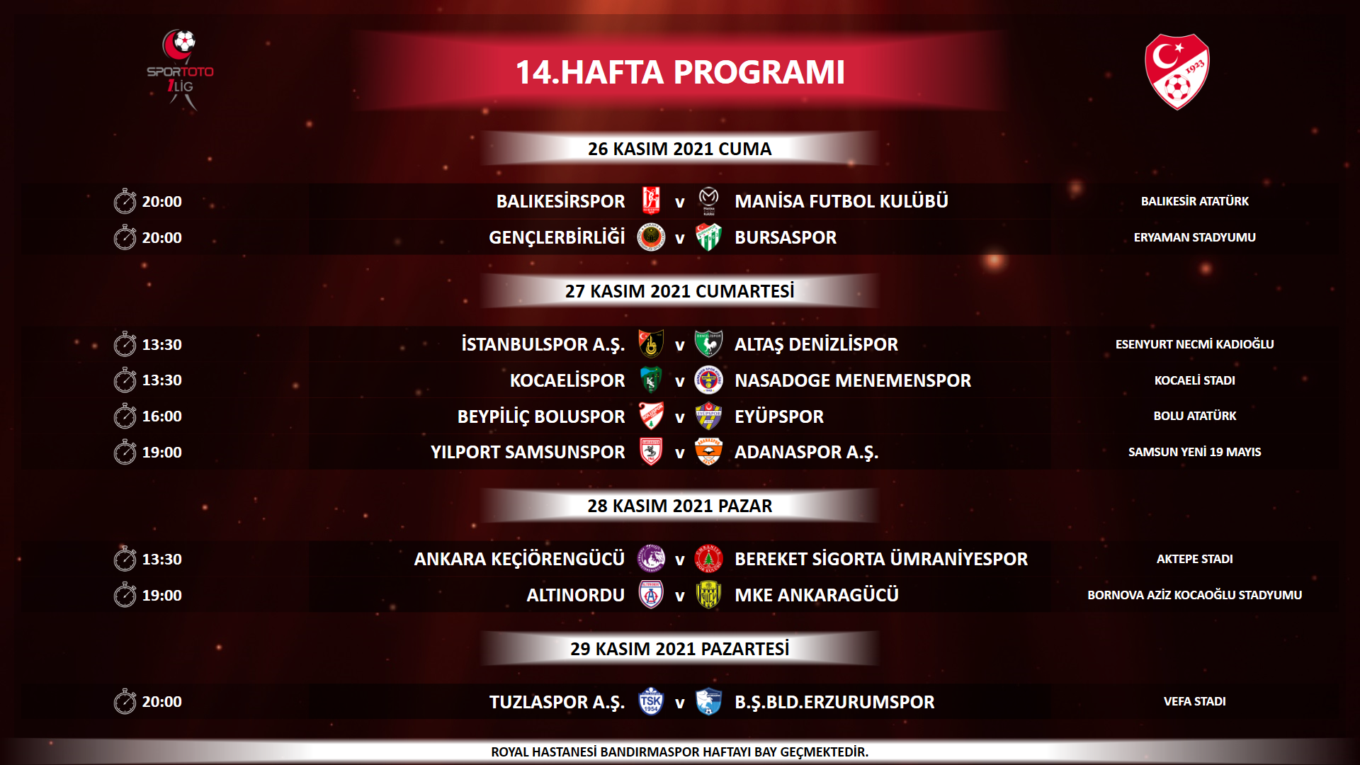 Spor Toto 1. Lig’de 14-18. hafta müsabakalarının programı belli oldu.