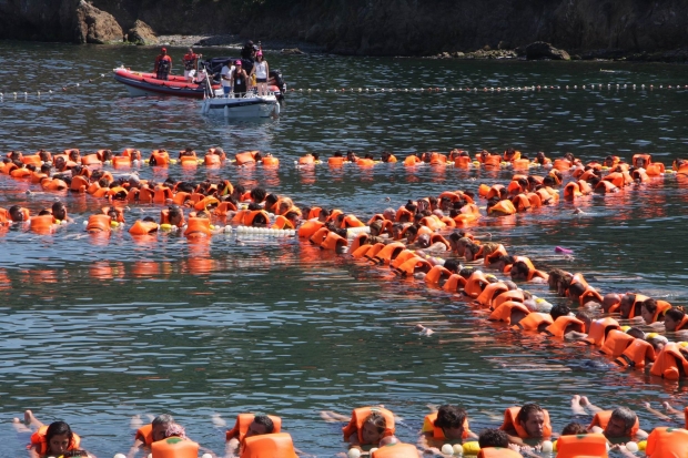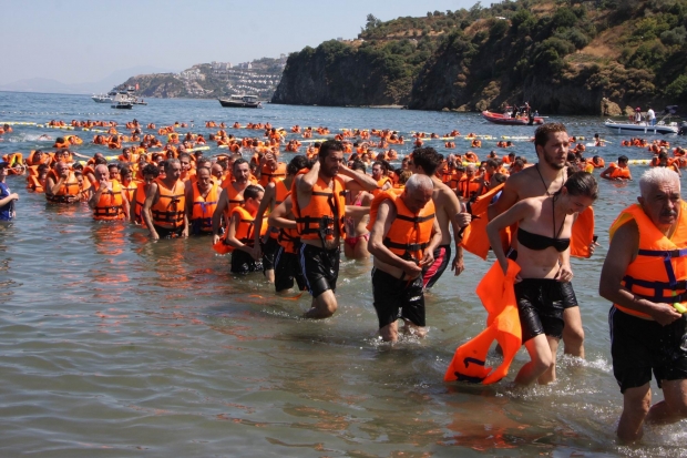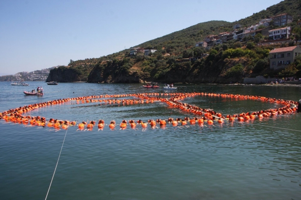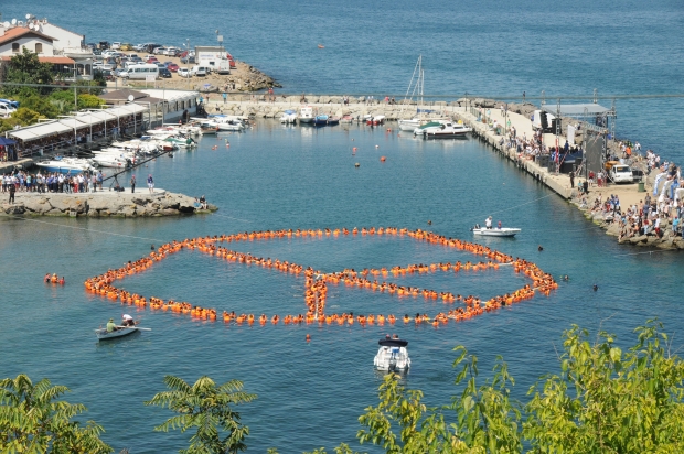 Kumyaka sahilinde resmi Guinnes hakemi ve gözlemcilerinin huzurunda, barış sembolü oluşturan 460 gönüllü 5 dakika boyunca denizin içinde durarak Guinnes Rekorlar Kitabı’na girdi. Bursa’nın çeşitli ilçelerinden gelen katılımcıların gönüllü olduğu rekor için denize dubalar yerleştirildi. Deniz üzerinde oluşturulan barış sembolü, gönüllülerin dubalara tutunarak 5 dakika hareket etmeden sırt üstü uzanmasıyla tamamlandı. Barış sembolü şeklinin, bu süre zarfında bozulmaması üzerine rekor kayıtlara geçti. Sembolün oluştuğu sırada resmi Guinnes hakemleri de helikopterle havadan kayıt tuttu. Barış sembolünü oluşturan gönüllüler 5 dakikanın sonunda ayaklarını deniz çırparak rekor kırmanın mutluluğunu yaşadı.