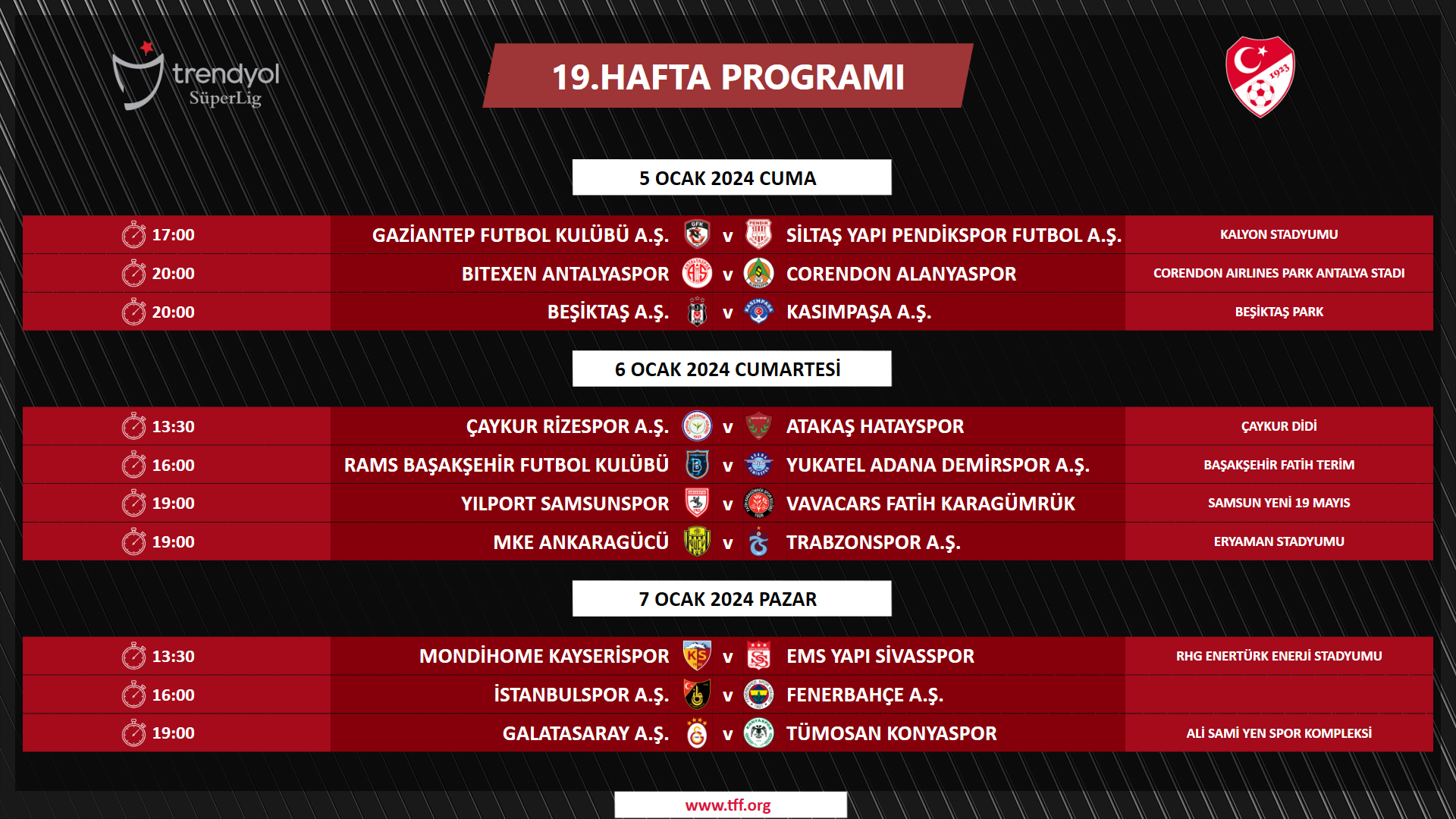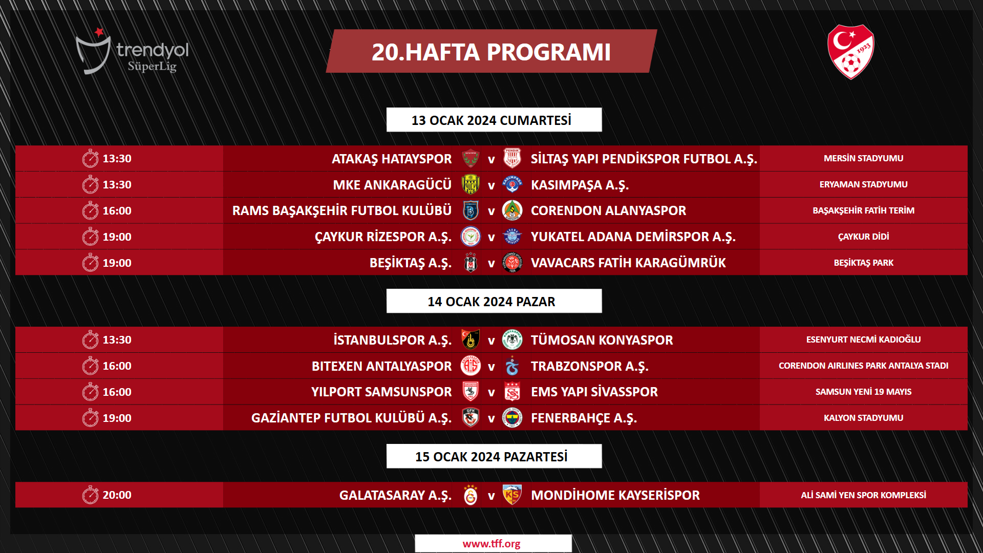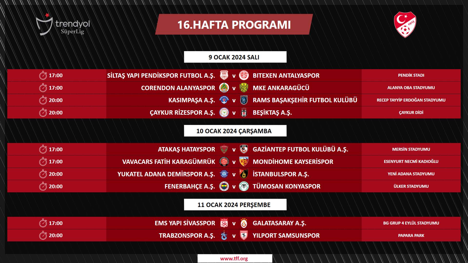 Türkiye Futbol Federasyonu (TFF) Trendyol Süper Lig’de ertelenen 16. hafta müsabakaları ile 19 ve 20. hafta müsabakalarına ilişkin programları açıkladı.