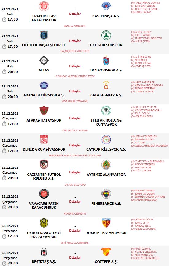 Türkiye Futbol Federasyonu Merkez Hakem Kurulundan yapılan açıklamaya göre, ligin 18. haftasında oynanacak maçlarda görev alacak hakemler şunlar: