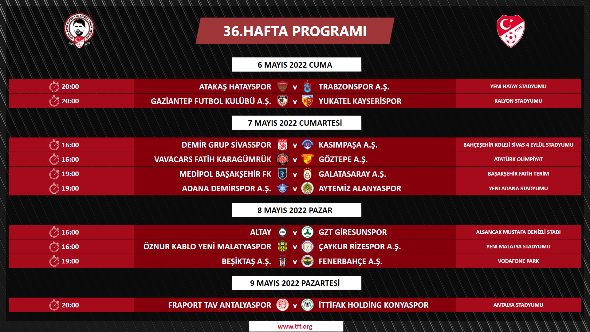 Ana Sayfa › Final › Futbol › Süper Lig’de 36. hafta açıklandı! Beşiktaş-F.Bahçe maçı ne zaman?Süper Lig’de 36. hafta açıklandı! Beşiktaş-F.Bahçe maçı ne zaman? Spor Toto Süper Lig Ahmet Çalık Sezonu 36. hafta müsabaka programı açıklandı. Giriş: 28-04-2022 15:35Kaynak: FutbolFinal ABONE OL + - Spor Toto Süper Lig Ahmet Çalık Sezonu 36. hafta müsabaka programı açıklandı. İŞTE PROGRAM HABERİ PAYLAŞ