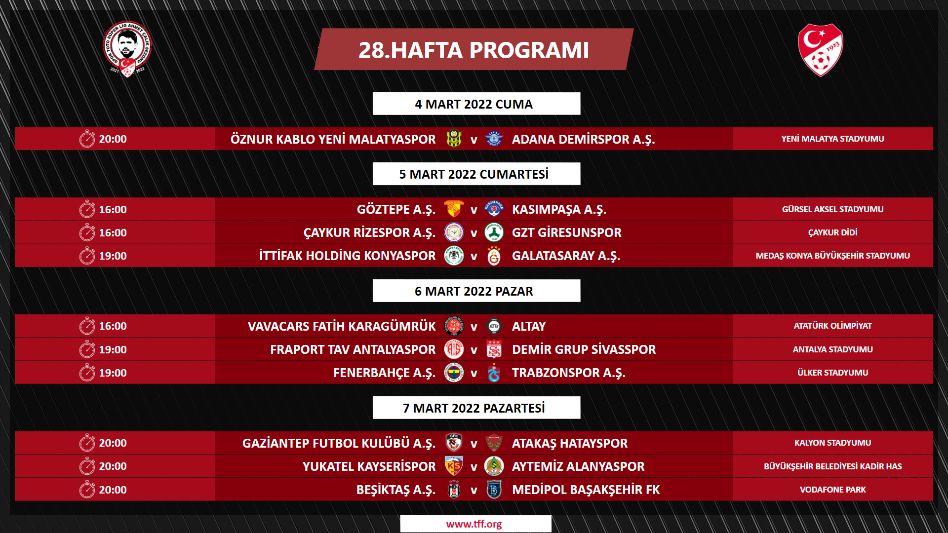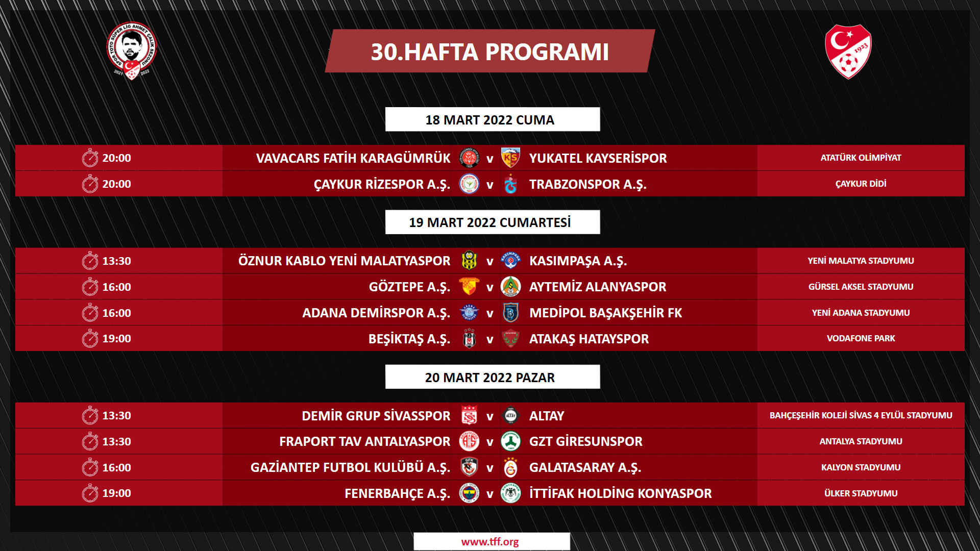 Ana Sayfa › Final › Futbol › Süper Lig’de 4 haftalık program açıklandıSüper Lig’de 4 haftalık program açıklandı Spor Toto Süper Lig 27-30. Hafta programları açıklandı. Giriş: 16-02-2022 19:47Güncelleme: 16-02-2022 20:31Kaynak: FutbolFinal ABONE OL + - Spor Toto Süper Lig Ahmet Çalık Sezonu 27, 28, 29 ve 30. hafta müsabakaları programı açıklandı. Karşılaşma programları şöyle: HABERİ PAYLAŞ