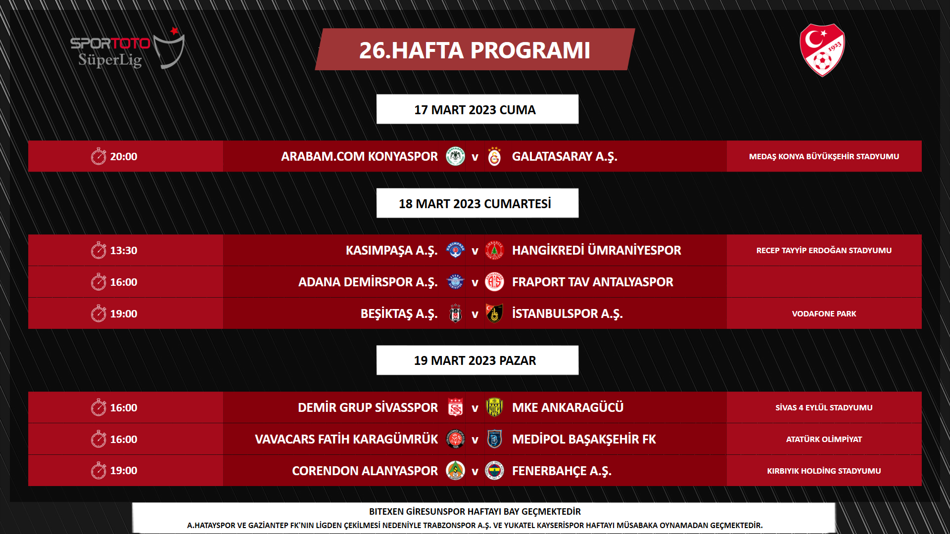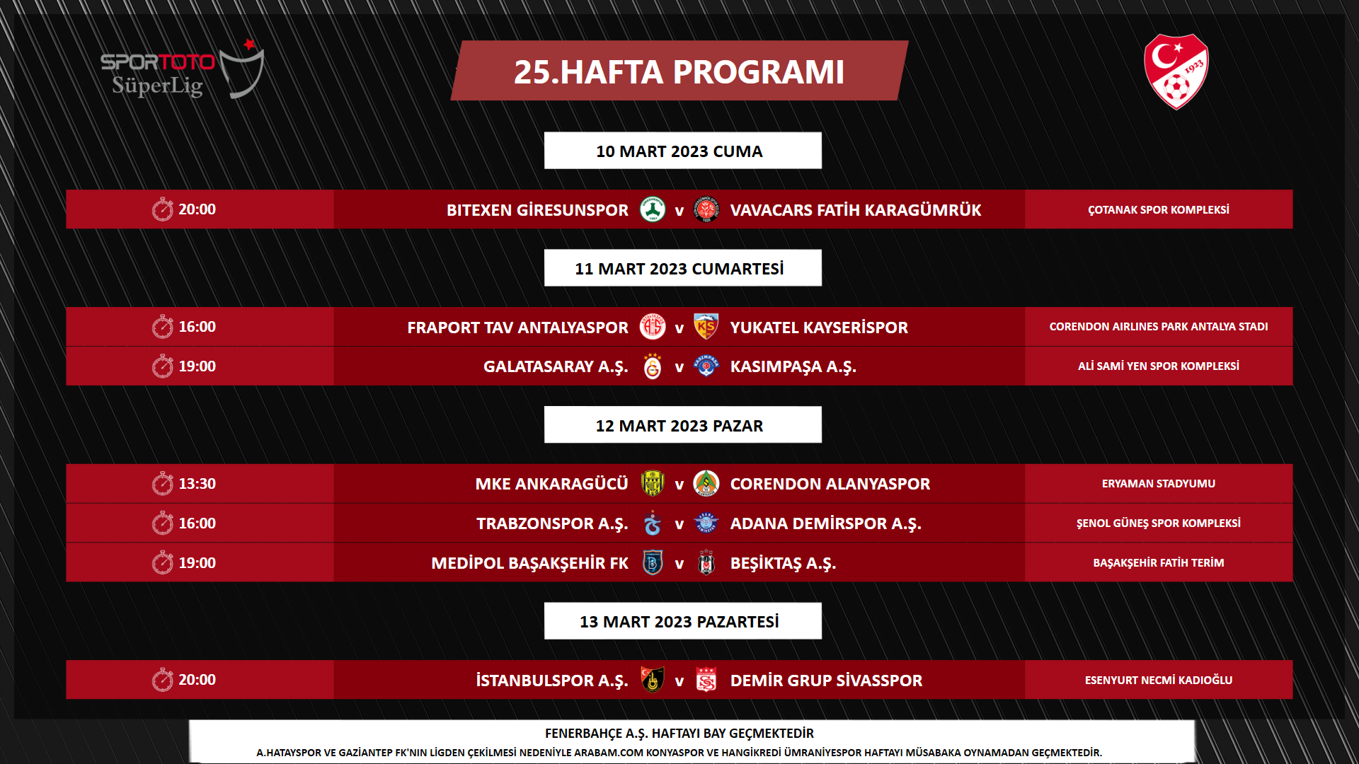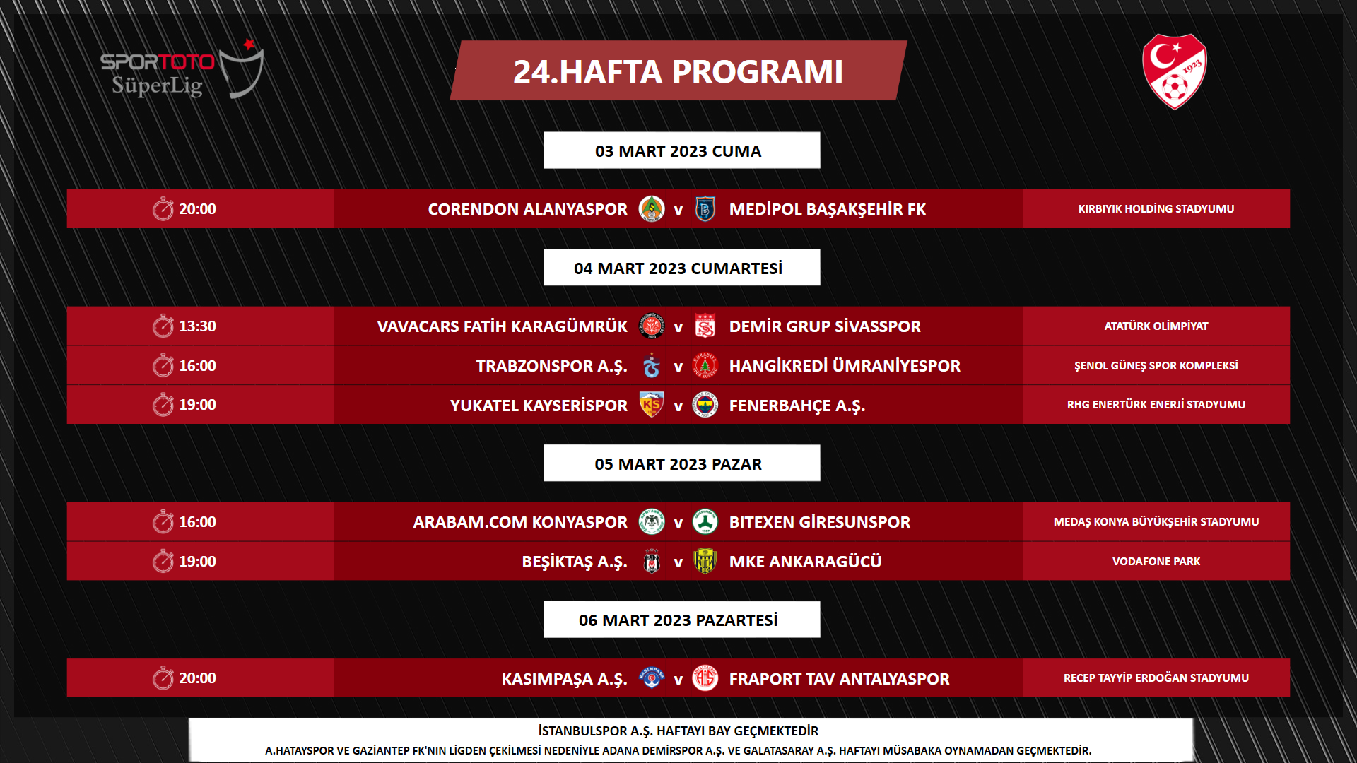 Bununla birlikte, deprem felaketinden dolayı ertelenen Spor Toto Süper Lig 23. hafta müsabakalarından Bitexen Giresunspor – Yukatel Kayserispor ve Fenerbahçe A.Ş. – Arabam.com Konyaspor müsabakaları 25 Şubat Cumartesi günü saat 19.00’da, HangiKredi Ümraniyespor – Adana Demirspor müsabakası ise 26 Şubat Pazar günü saat 16.00’da oynanacaktır.