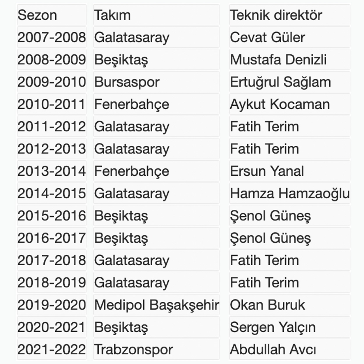 Süper Lig’de 2006-2007 sezonundan sonra şampiyonluk yaşayan takımlar ve teknik direktörler şunlar:
