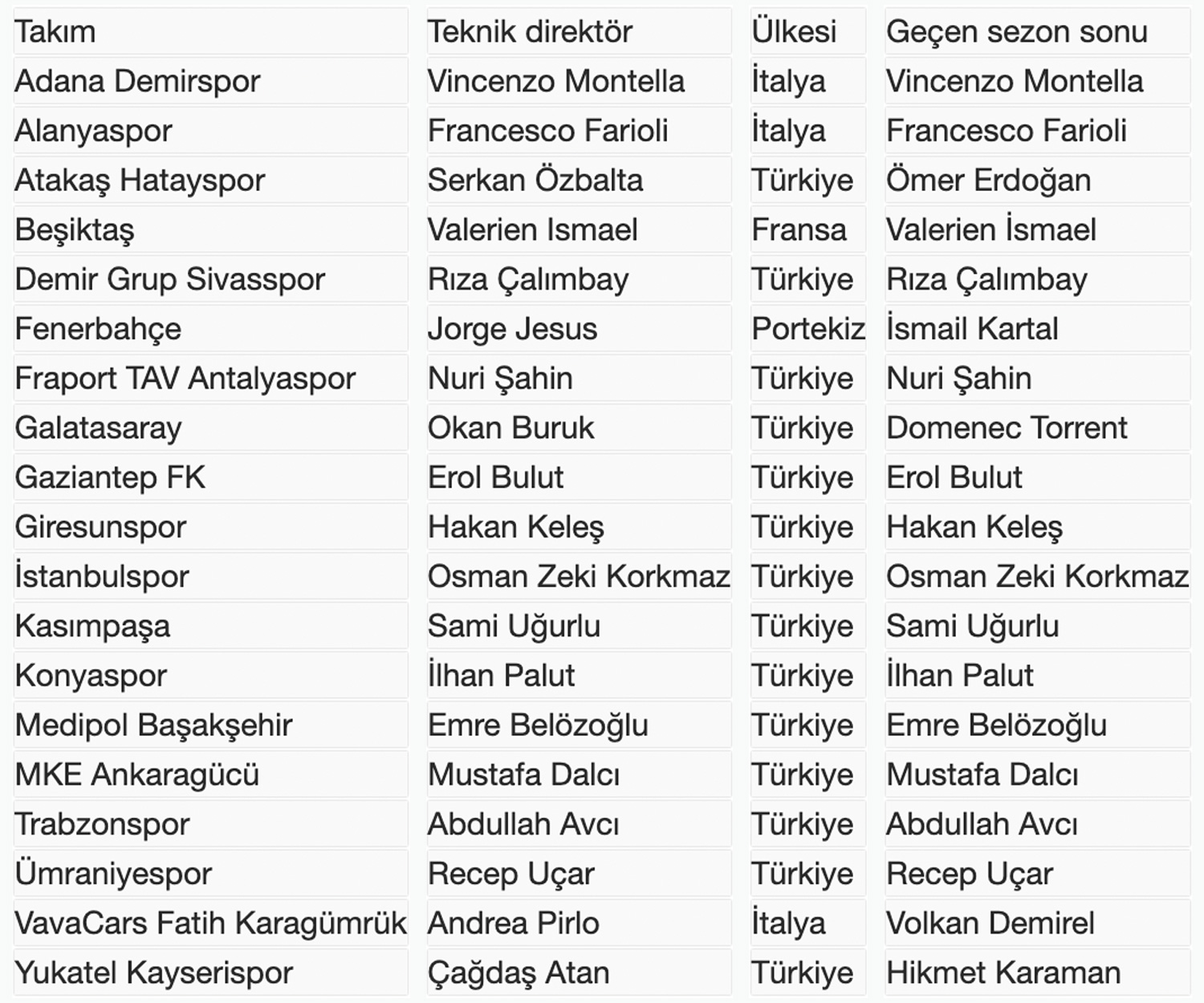 Süper Lig’de 2022-2023 sezonunda görev yapacak teknik direktörler ile geçen sezon sonu itibarıyla bu takımları çalıştıran teknik adamlar şunlar: