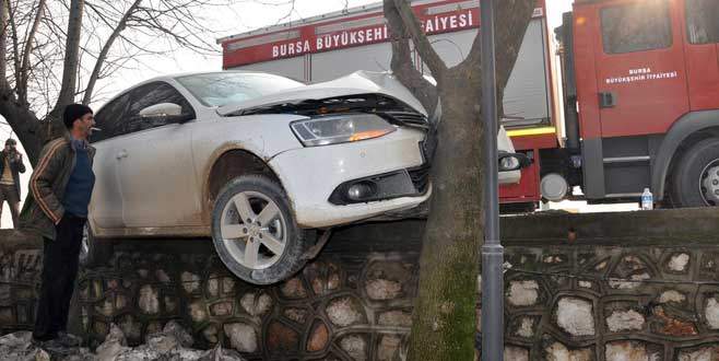 İnegöl'de, istinat duvarına çıkan otomobil, daha sonra ağaca çarptı. Kadın sürücü kazayı burnu bile kanamadan