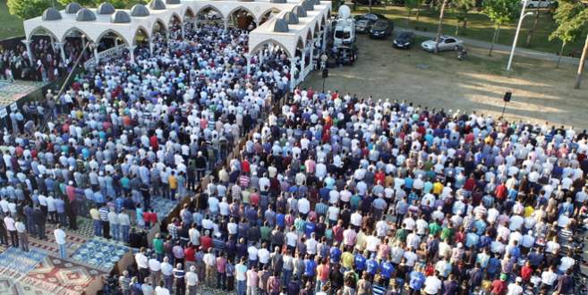 Bursa'da bayram namazı, Merinos Park’ta Harem-i Şerif’teki Osmanlı revaklarından esinlenerek oluşturulan açık namazgahta kılındı.