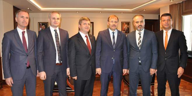 İnegöl Belediye Başkanı Alinur Aktaş, beraberindeki Başkan Yardımcısı Alper Taban, AK Parti İlçe Başkanı Adem