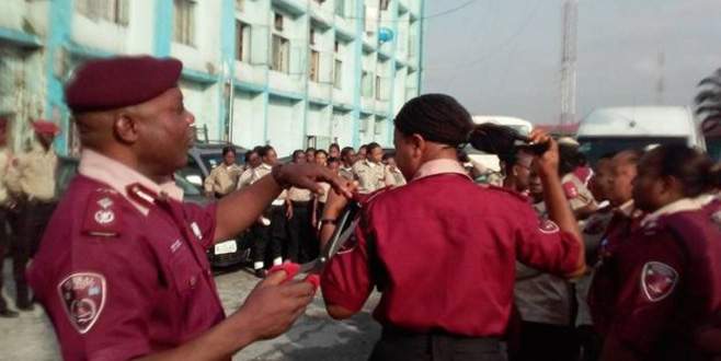 Afrika'nın en kalabalık ülkesi Nijerya'da, Andrew Kumapayi adlı erkek amir elinde makasla kadın polislerin saçını