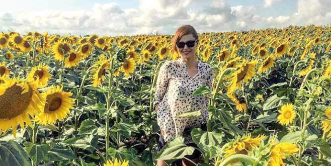 Güzel oyuncu Tuvana Türkay, tatil yolculuğu sırasında gördüğü ayçiçeği tarlasının içine girerek, kendini adeta doğaya