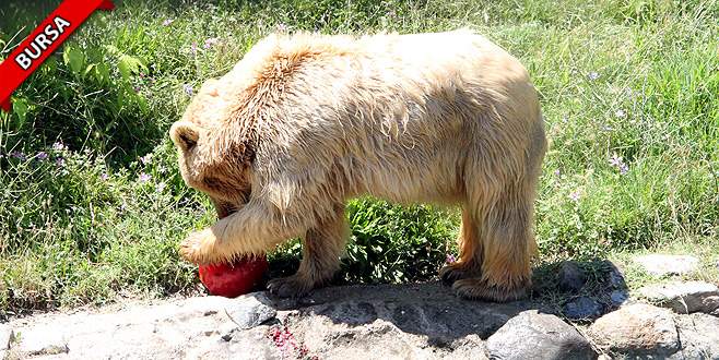 Bursa hayvanat bahçesindeki ayılar aşırı sıcaktan bunalınca görevlilerin verdiği meyveli dondurma ile serinliyor. Develerin ise