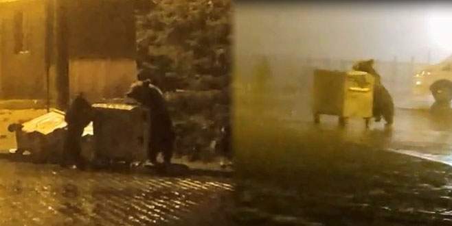 Uludağ'da aç kalan yavru ayının çöp konteynerlerini karıştırma anı kameraya yansıdı.