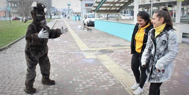 Bursalı tiyatro sanatçısı, soğuktan ve açlıktan ölen hayvanlara dikkat çekmek için ayı kostümü giyip sokaklarda