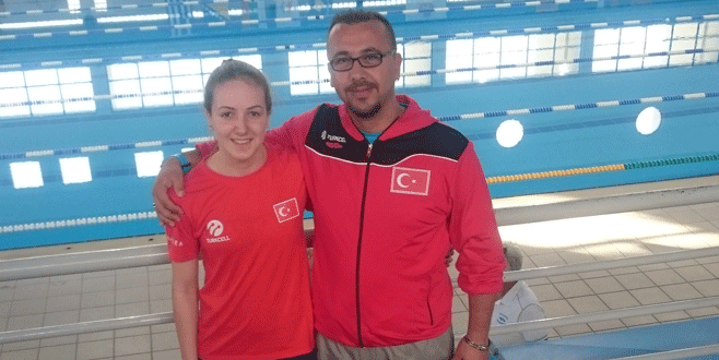 Antrenör Murat Konak ile birlikte ilk kez Balkan Şampiyonası'nda kulaç atan genç sporcu mutluluktan uçuyor.