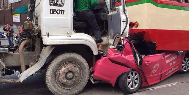 Tayland’ın başkenti Bangkok’ta meydana gelen kazada bir taksi otobüsün ve kamyonun arasında kaldı, taksinin şoförü