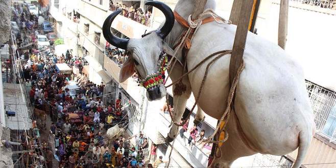Pakistan'da bir besici evinin çatısında beslediği kurbanlıkları vinç yardımı ile indirerek kurban pazarına götürdü.