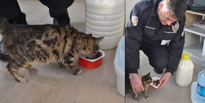 Bursa’da donmak üzere olan kediye polisler sahip çıktı