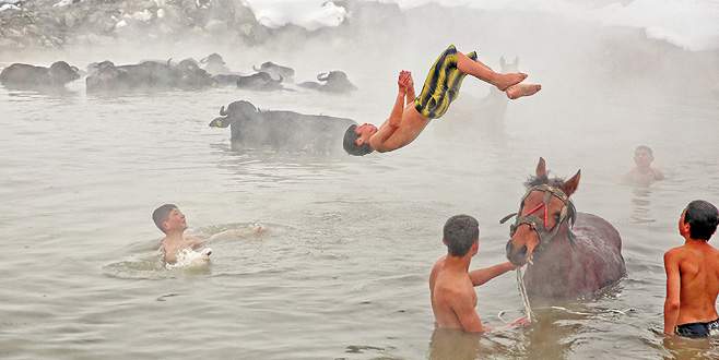 Yazın büyük ilgi gören Bitlis'in Budaklı Köyü'ndeki kaplıcanın, kış aylarındaki sahipleri manda ve atlar oluyor.