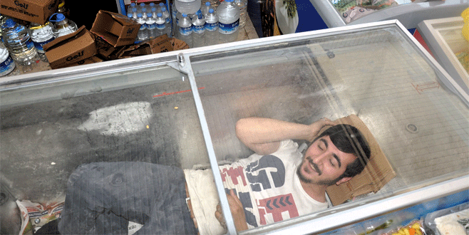 Sıcaktan bunalan esnaf dondurma dolabında serinliyor