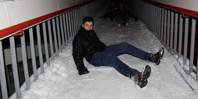 Bursa’nın Mudanya ilçesinde çocuklar üst geçitleri buz pisti gibi kullanıyor. Tepsilerle üst geçitten kayan çocuklar