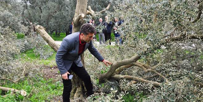 Referandum çalışması için İznik'e giden CHP Bursa Milletvekili Orhan Sarıbal, bir zeytinlikteki kesilmiş zeytin ağaçlarını