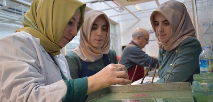 Makedonyalı ikiz kardeşler Şükran ve Ümran Ramadan, Bursa Büyükşehir Belediyesi’nin desteğiyle ebru eğitimi almak için